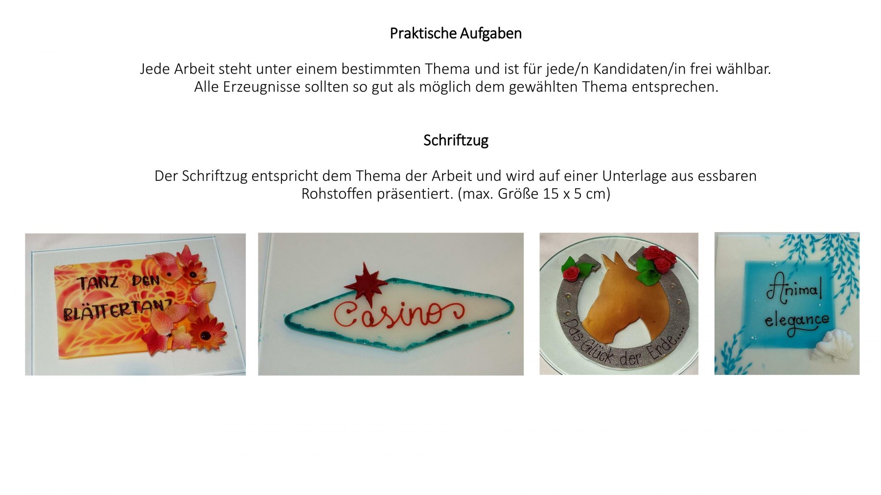 Am Dienstag begann der Wettbewerb um 8 Uhr. Die stellvertretende Schulleiterin sprach ein Grußwort und wünschte allen Teilnehmer*innen viel Erfolg. Es wurden individuelle Kleintorten, fantasievoll dekorierte Petit Fours, unterschiedliche Pralinen sowie ein Schaustück zu einem selbstgewählten Thema hergestellt.
