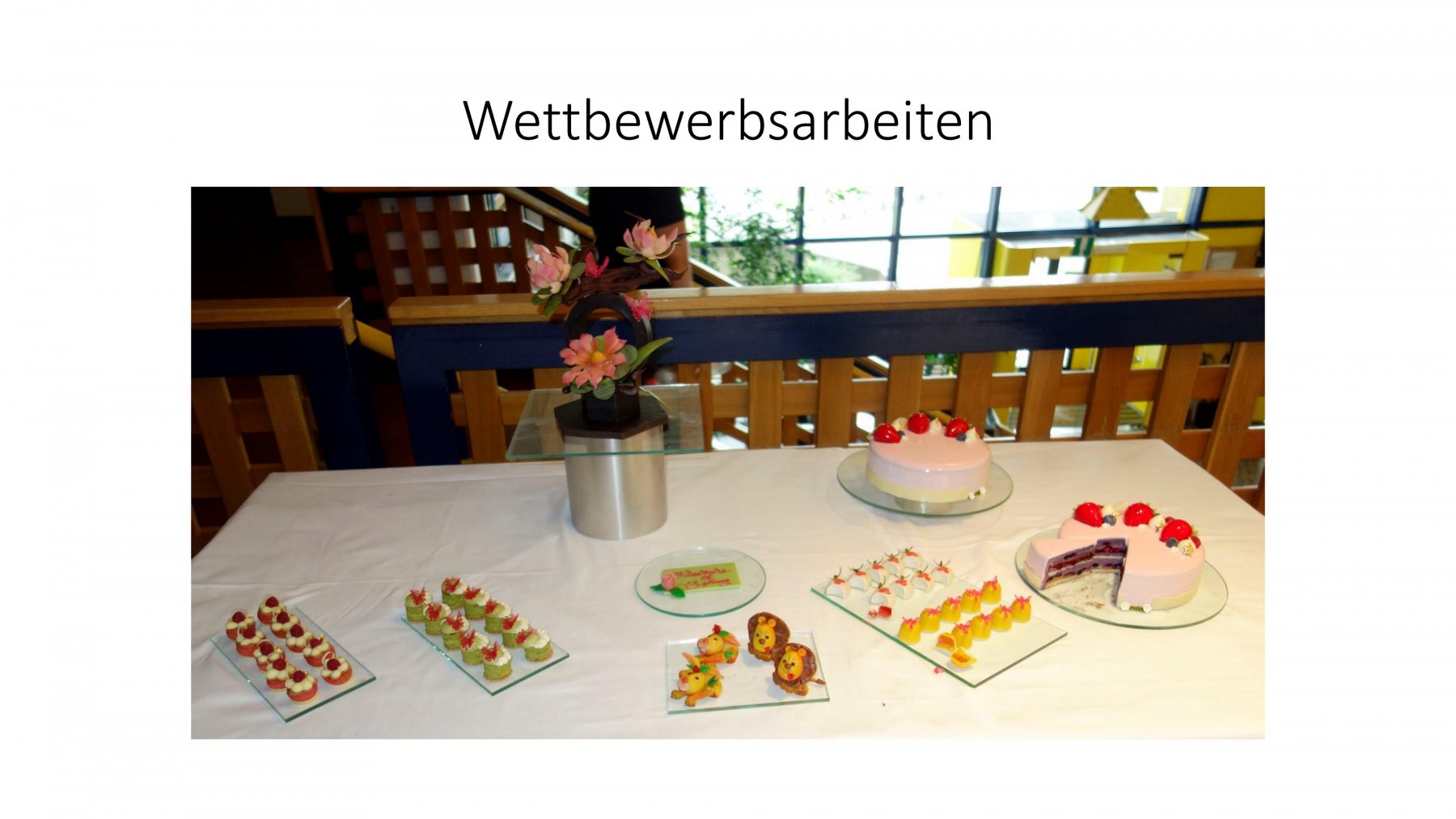 Am Dienstag begann der Wettbewerb um 8 Uhr. Die stellvertretende Schulleiterin sprach ein Grußwort und wünschte allen Teilnehmer*innen viel Erfolg. Es wurden individuelle Kleintorten, fantasievoll dekorierte Petit Fours, unterschiedliche Pralinen sowie ein Schaustück zu einem selbstgewählten Thema hergestellt.